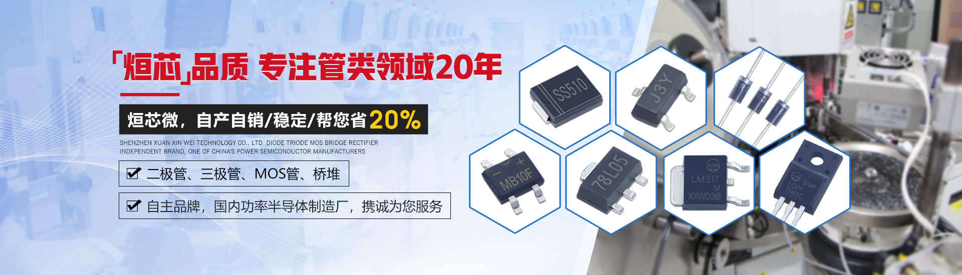 深圳市烜芯微科技有限公司是一家集研發(fā)、生產(chǎn)、銷售于一體,專注于二極管、三極管,MOS管、橋堆等功率半導體領域發(fā)展的企業(yè)。采用國際領先的GPP芯片生產(chǎn)工藝及一心多Die高精密制造工藝,擁有功率半導體器件工程實驗室,全自動高精密生產(chǎn)設備,產(chǎn)品層層把控,全程可追溯,保障了每只產(chǎn)品的卓越品質。 產(chǎn)品封裝包括SMA,SMAF,SMB,SMBF,SMC,SOD-123,SOD-123FL,SOD-323,SOD-323FL,SOD-523,SOD-723,SOT-23,SOT-89,SOT23-3L,SOT23-5L,SOT23-6L,SOT-223,SOT-523,SOT-723,DO-41,DO-15,DO-27,DO-35,R-1,R-6,LL-34,LL-41,TO-277,TO-92,TO-92S,TO-92L,TO-126,TO-251,TO-252,TO-262,TO-263,TO-220,TO-220F,TO-247,TO-3P,TO-264,MBS,MBF,MBM,ABS,UMB,UMSB,DB,DBS,D3K,KBP,GBP,GBU,GBL,GBJ,KBL,KBU,KBJ,KBPC,KBPC6,KBPC8,KBPC-W,DNF,TSSOP-8,TSSOP-16,SOP-4,SOP-6,SOP-8,SOP-10,SOP-14,SOP-16,DIP-4,DIP-6,DIP-8,DIP-10,DIP-14,DIP-16,月產(chǎn)各封裝達6億只。 公司通過了ISO14001環(huán)境管理體系認證,產(chǎn)品均獲得了ISO9001質量體系認證、UL、SGS等認證,符合歐盟最新RoHs指令。擁有和致力于烜芯微/XXW自主品牌產(chǎn)品的推廣,提供技術支持,選型替換,cost down方案及擁有專業(yè)的生產(chǎn)管理團隊和銷售團隊,保證了供貨穩(wěn)定及售前選型服務等問題。 公司產(chǎn)品廣泛應用于開關電源、適配器、逆變器、控制器、汽車電子、家用電器、通訊設備、無線充、鋰電池保護板、驅動電機、安防警報、太陽能光伏產(chǎn)業(yè)等多個領域。取得了國內外眾多品牌大廠的認可與合作,我們將堅持奉行“烜芯品質,誠信經(jīng)營,合作共贏”為公司經(jīng)營理念!竭誠為新老客戶提供優(yōu)質的產(chǎn)品及服務。